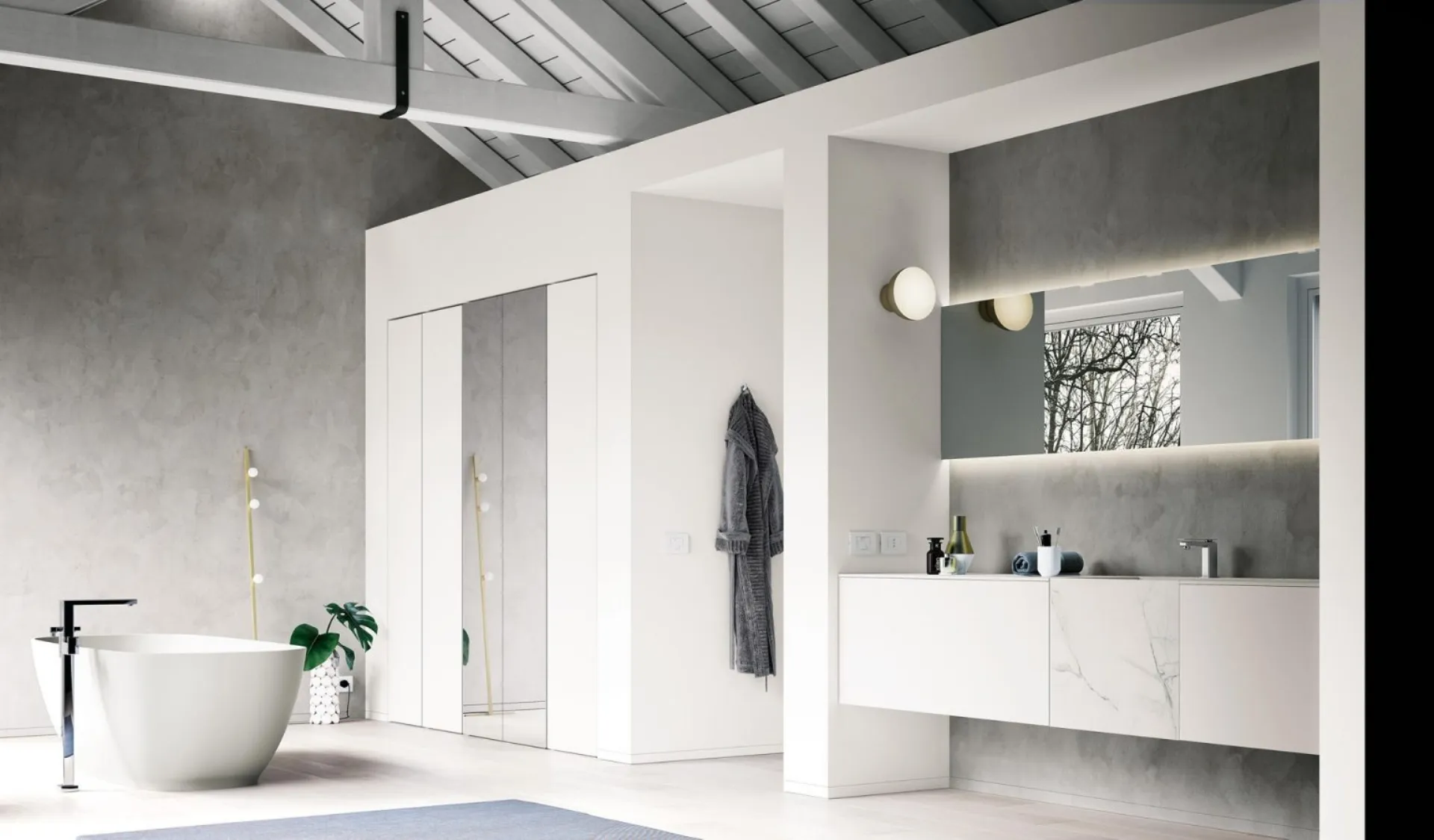 Arreda il tuo bagno moderno perfettamente con Mk1 02, mobili bagno sospesi e oggetti in laccato opaco di Nova Cucina.