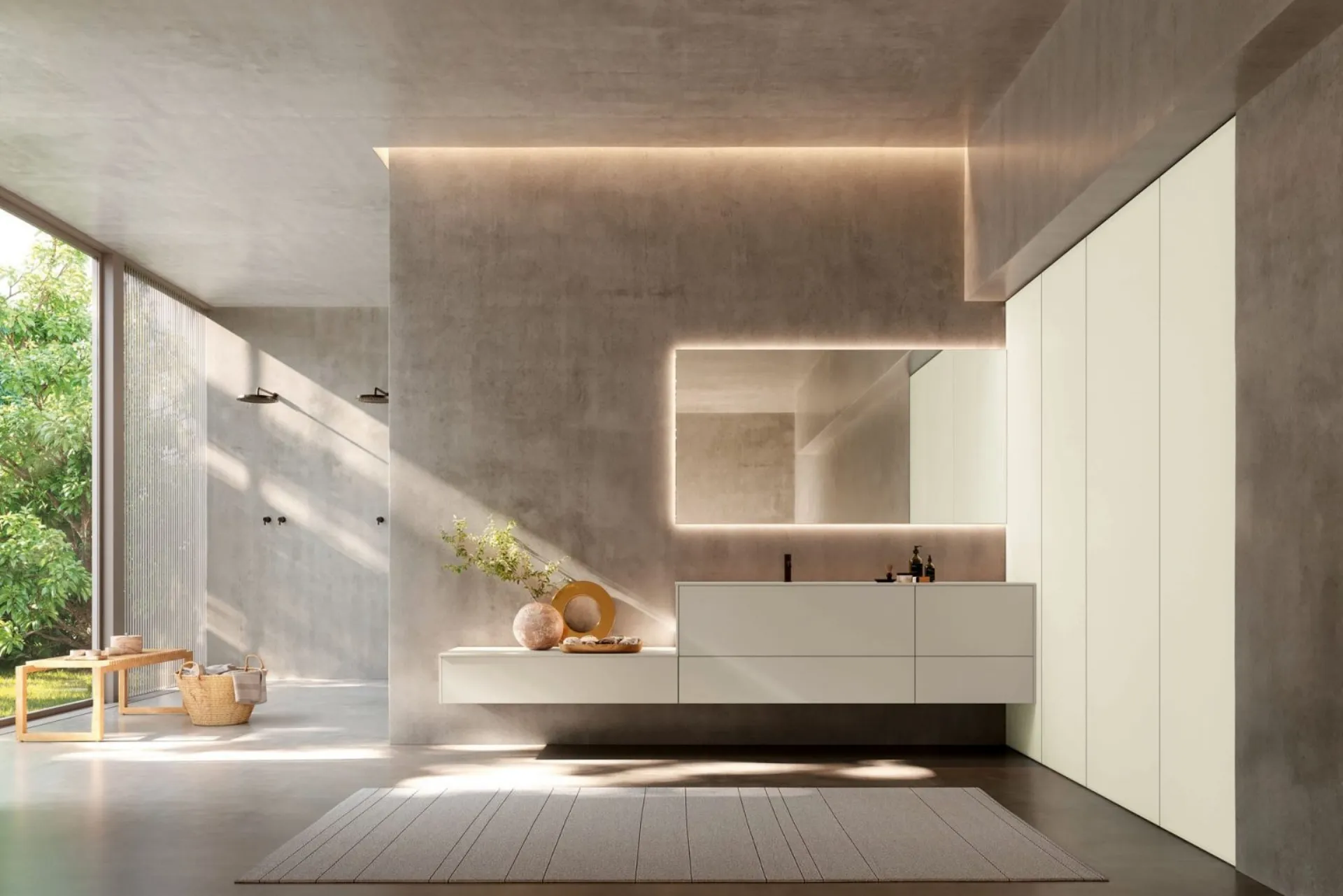 Scopri di più sull'arredo bagno moderno: mobili bagno sospesi in laccato opaco come il modello Kyton 17 di Nova Cucina ti attendono.