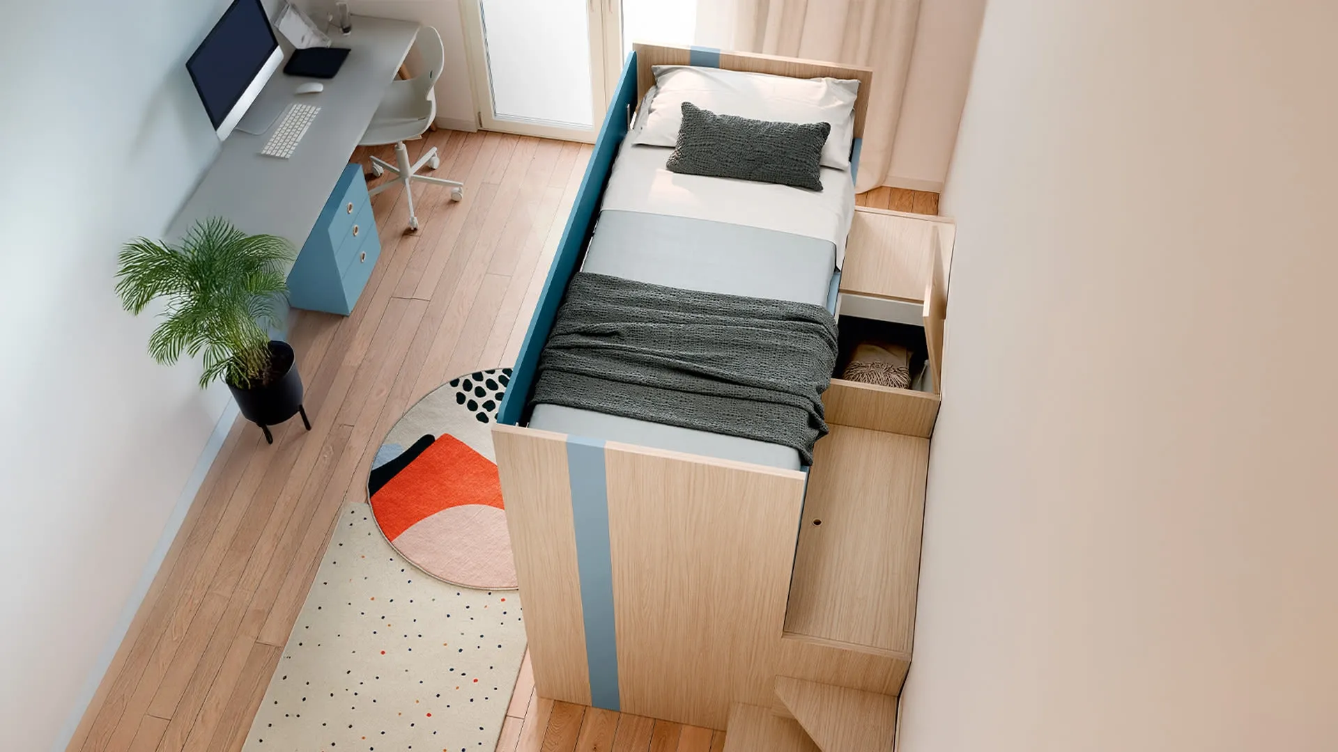 Con questa cameretta Castello Lila Nidi, tra le soluzioni con letti a castello, potrai progettare stanze moderne per bambini.