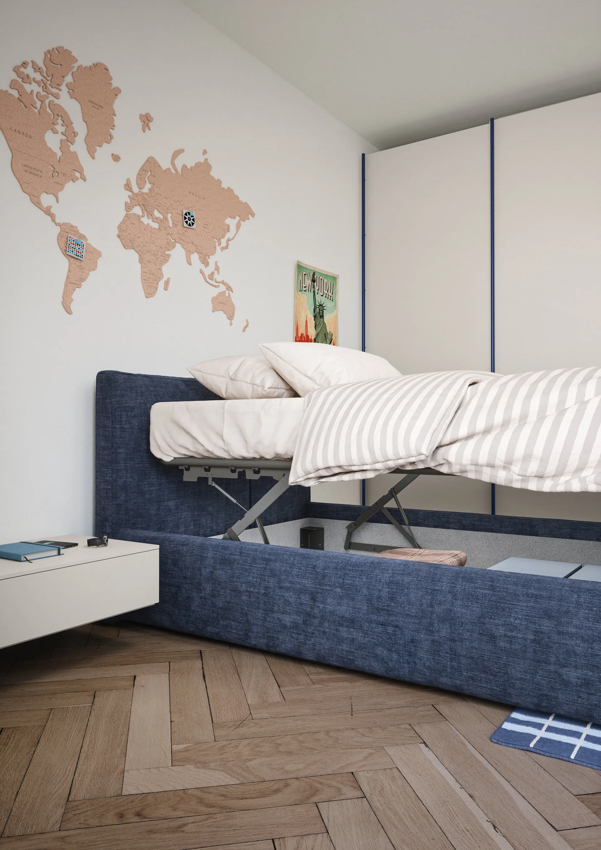 Se sei alla ricerca di letti singoli con contenitore, ti presentiamo il modello Swell in tessuto per impreziosire la cameretta.