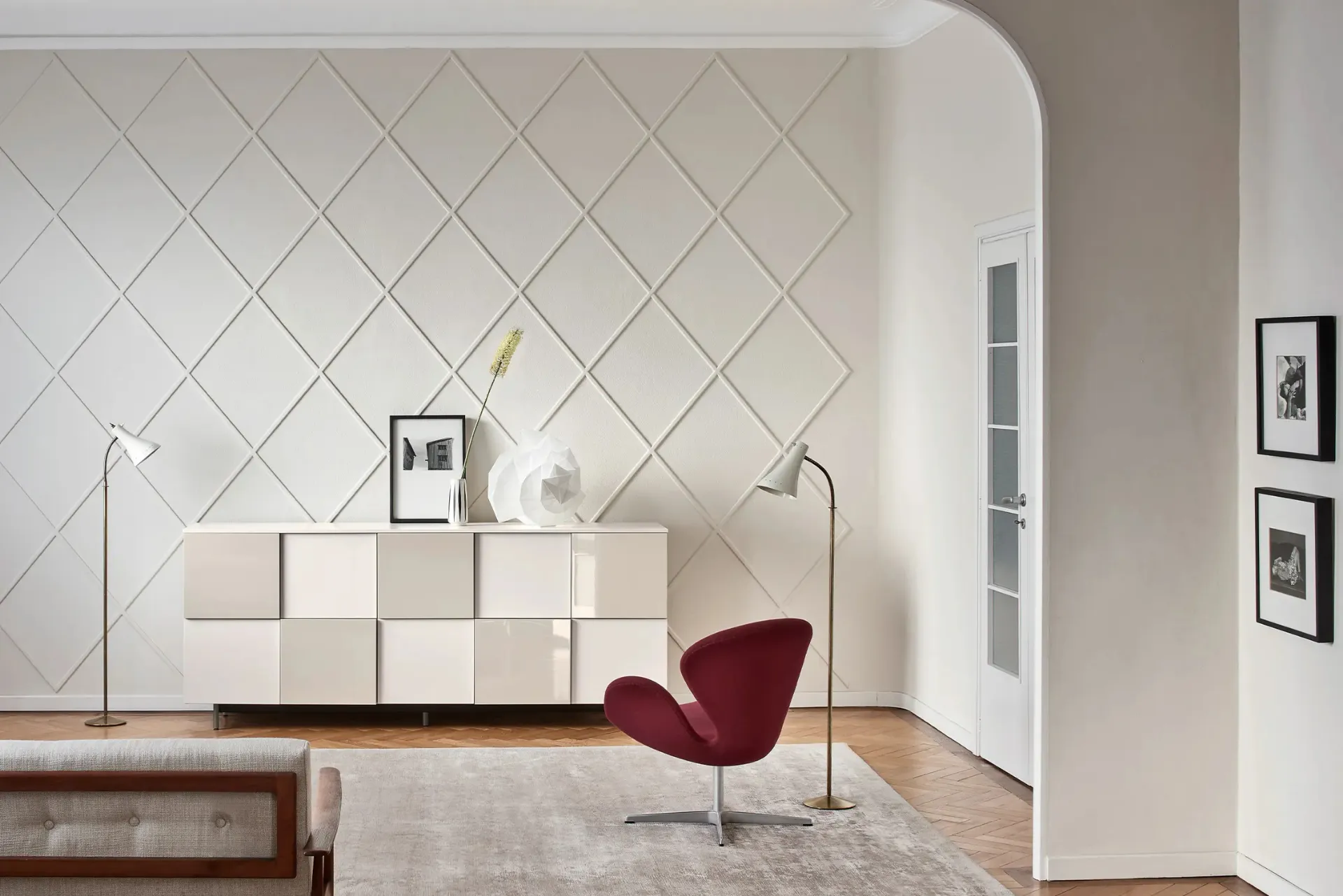 Arreda un living dinamico e operativo con questa madia Incontro 07 di Sangiacomo: scopri le più originali Madie in laccato lucido.