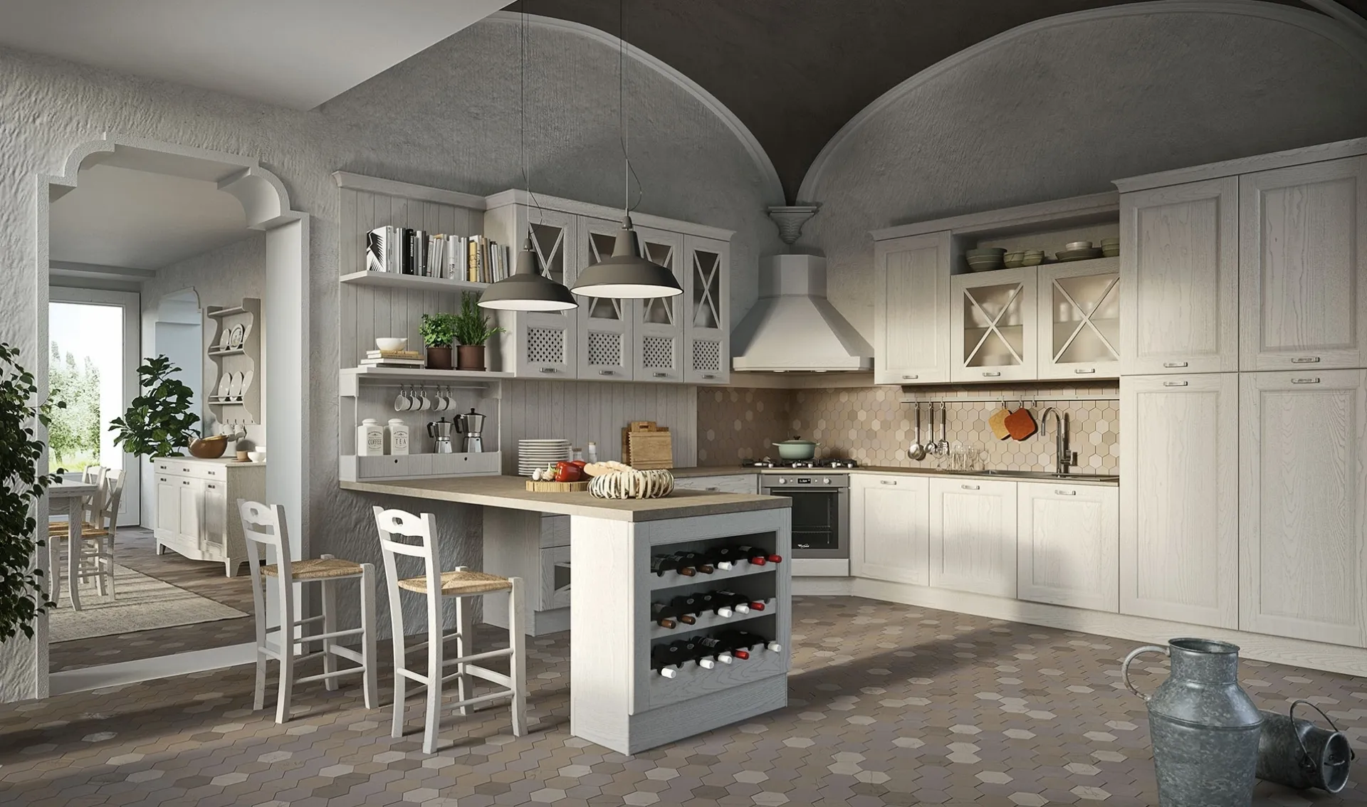 Cucine con penisola Aran: entra e scopri un mondo di stile e design! La cucina classica Bellagio in Frassino Bianco ti sta aspettando.