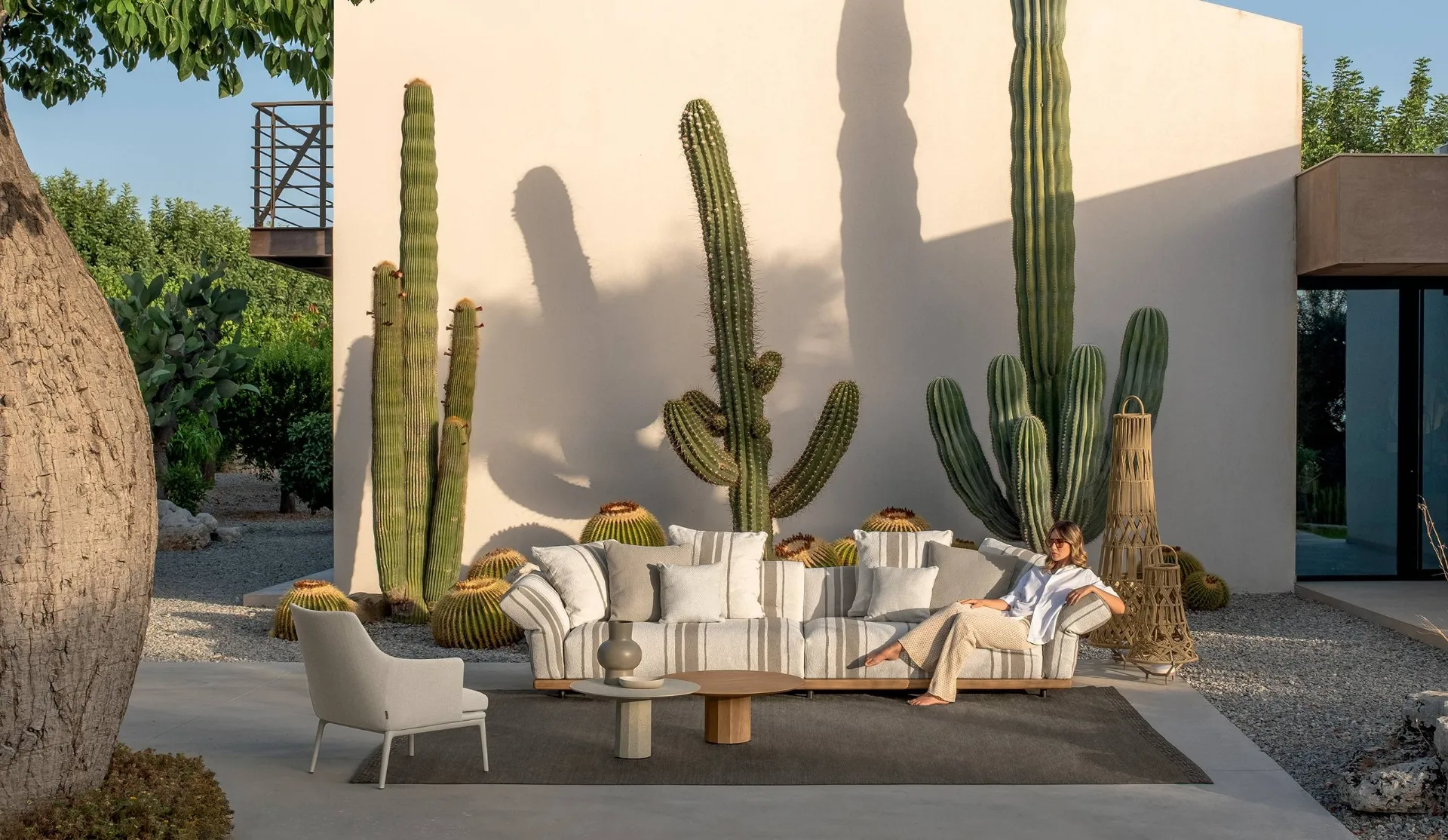 Un ricco catalogo di divani da giardino in tessuto ti sta aspettando nel nostro showroom: clicca e scopri il modello Elton Divano di Talenti.